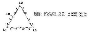對△形連接最普通的電壓是120/240或110/220。一半的相電壓可由串接繞組和線之間得到。(L1-L0)