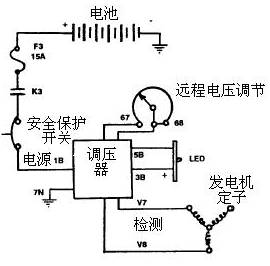 調壓器檢測發電機的輸出電壓,并按輸出電壓的幅度使固定的LED(發光二極管)亮或者滅。調壓器的電源由發電機組電池提供。