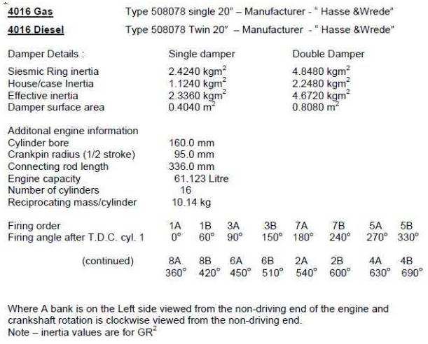 該扭轉(zhuǎn)振動分析的目的是計算出量級和擾動力頻率的臨界轉(zhuǎn)速點,并確保破壞臨界速度超出了引擎運行范圍,且非常明顯地使其在+10%到-5%的同步速度范圍內(nèi)。有一些臨界轉(zhuǎn)速可能在從啟動到同步轉(zhuǎn)速的95%范圍內(nèi),但是這些都可能被視為“安全”,臨界轉(zhuǎn)速立刻通過,因為“臨界轉(zhuǎn)速”1秒左右立刻通過。