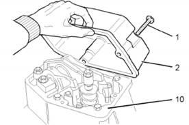 12確保搖臂室蓋(2)清潔無(wú)損壞。確保搖臂底座 (10)的接合面清潔無(wú)損壞。