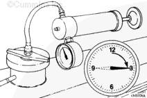 向發(fā)動(dòng)機(jī)冷卻系統(tǒng)加壓。參考步驟 008-018。檢查缸套座前應(yīng)加壓 15 分鐘。一定要確保檢查前系統(tǒng)內(nèi)保持有氣壓。