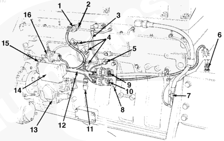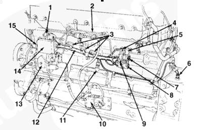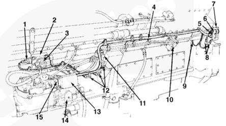 1燃料切斷閥,2空燃比控制傳感器管,3保險絲 (5A),4系統接地接頭,5 OEM C5 和 C6 接頭支架,6發動機轉速傳感器,7 C5 接頭,8 C6 接頭,9油軌壓力傳感器和燃油塊,10液壓機械式 STC 執行器,11發動機側數據通信接口接頭,12發動機線束,13燃油泵,14ECM,15電子燃油控制閥。