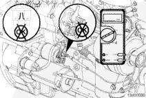 如果萬用表指示電壓且起動馬達無法工作,則起動馬達電磁閥有故障,必須進行更換。參考第 13 節中的步驟 013-020。