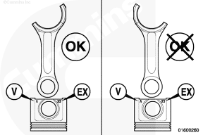 由于氣門套位于活塞頂部,QSK78 鍛造鑄鐵 (FCD) 活塞必須以特定的方向安裝。“EX”標記位于連桿柄的長側,而“V”標記位于連桿柄的短側。