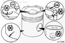不要使用金屬刷。金屬刷會損壞活塞環槽。不要用玻璃噴丸清潔活塞環槽??墒褂昧慵枮?822735的胡桃殼或塑料噴丸對活塞環槽和活塞頂進行噴丸處理。用最小的有效壓力,并且不要長時間集中噴射一個區域。塑料噴丸的推薦工作壓力是276 kPa [40 psi]。