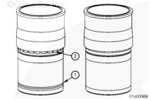通過康明斯ISX15 CM2250發動機缸套下部外徑上加工出的條帶 (1) 可以輕易識別出工廠墊片調整缸套。安裝缸套后,同樣可以看到此條帶。這些缸套在中間限位座合區域還包含有固定式硬化黃銅墊片 (2)。