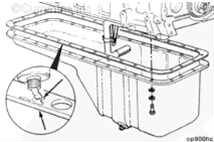 在新油底殼密封墊的兩側涂上一圈 2-mm [0.063-in] 的 RTV,零件號 3164067。