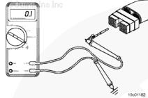 檢查觸針之間是否存在短路。按前述方法設置開關以隔離巡航控制開關電路。將巡航控制/PTO ON/OFF 開關置于 OFF 位置。將測試導線插入巡航控制 ON/OFF 開關輸入觸針。用鱷魚夾連接萬用表。將另一根測試導線插入開關回路導線,并測量電阻。