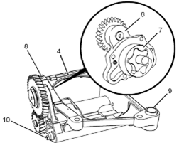 4如有必要,從Perkins1106A/C發(fā)動機機油泵的前蓋組件(6)上卸下螺栓(10)。從Perkins1106A/C發(fā)動機機油泵(4)上卸下前蓋組件(6)。