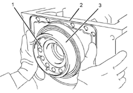 4.對(duì)齊塑料套管(3)與Perkins1106A/C發(fā)動(dòng)機(jī)曲軸法蘭(1)。確保塑料套管在Perkins1106A/C發(fā)動(dòng)機(jī)曲軸法蘭上嚙合。將新Perkins1106A/C發(fā)動(dòng)機(jī)曲軸后油封(2)的四角推到Perkins1106A/C發(fā)動(dòng)機(jī)曲軸法蘭上。在這個(gè)操作過(guò)程中,會(huì)把塑料套管壓出Perkins1106A/C發(fā)動(dòng)機(jī)曲軸后油封。棄置塑料套管。