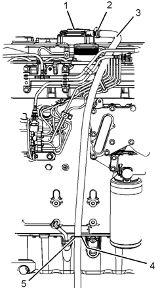 6將軟管(3)連接到Perkins1106A/C發動機氣門機構蓋(1)和Perkins1106A/C發動機曲軸箱呼吸器的濾清器座(5)上。